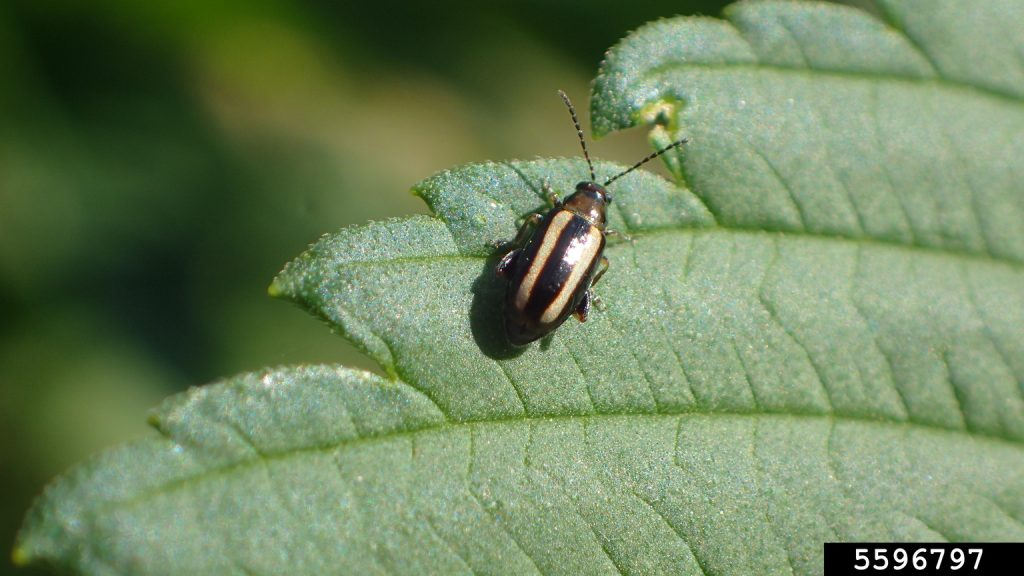 Es un pequeño escarabajo que salta como pulga y se alimenta de las hojas, causando muchos agujeros pequeños.