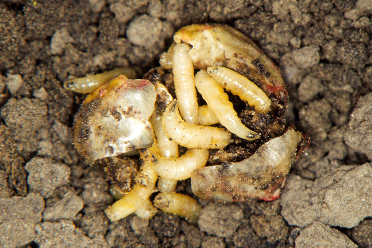 Las larvas atacan las semillas o plántulas jóvenes, alimentándose de ellas y provocando que la planta no germine o muera al inicio del cultivo.